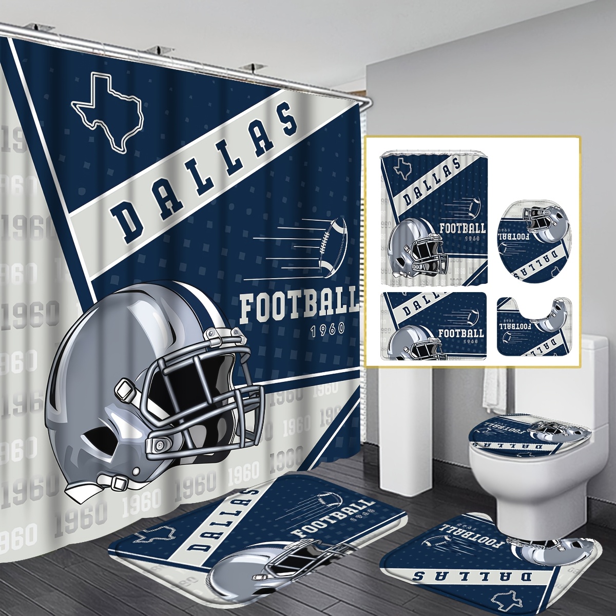 4pcs Football Helmet Shower Curtain - Dallas Team Gift Bath Curtain- Machine Washable Bath Drape With Hooks, Football Helmet-printed Accessory For Bathroom This product is available on TEMU. Click the button above to view full details, photos, and reviews on the TEMU website. Prices may vary.