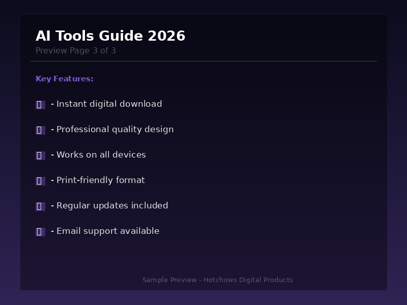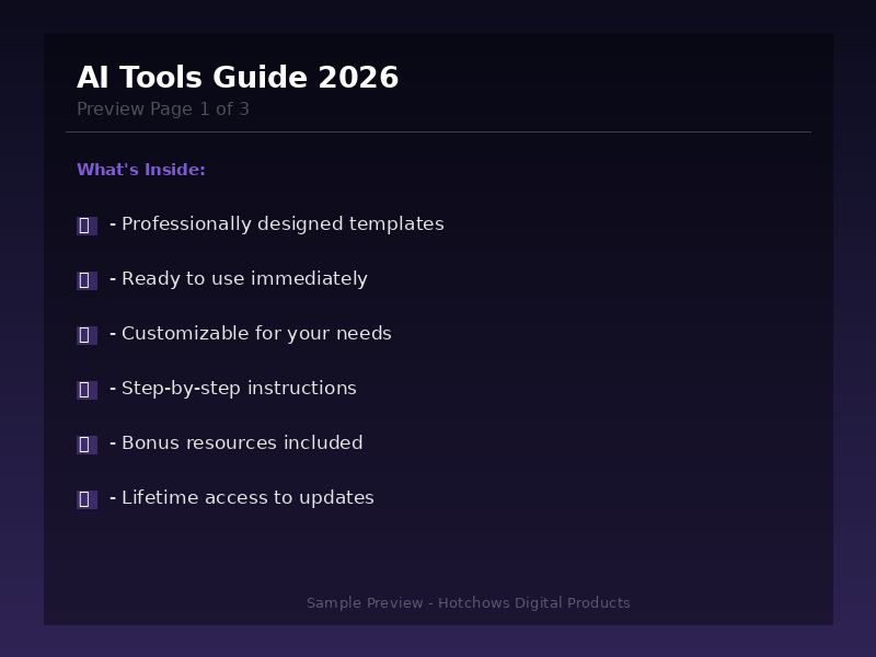 Master AI and 10x Your Productivity This comprehensive guide reviews 100+ AI tools across 8 categories: • Writing AI — ChatGPT, Claude, Jasper, Copy.ai, and more • Image Generation — Midjourney, DALL-E, Stable Diffusion, Leonardo • Video AI — Runway, Pika, Synthesia, HeyGen • Audio AI — ElevenLabs, Murf, Descript, AIVA • Coding AI — GitHub Copilot, Cursor, Replit, v0 • Marketing AI — Surfer SEO, Grammarly, Canva AI • Productivity AI — Notion AI, Otter.ai, Fireflies • Business AI — Zapier AI, Beautiful.ai, Tome Each tool reviewed with: What it does, pricing, best use case, and pro tips. BONUS: Prompt Engineering Basics + AI Workflow Automation Guide Format: PDF eBook Instant Download
