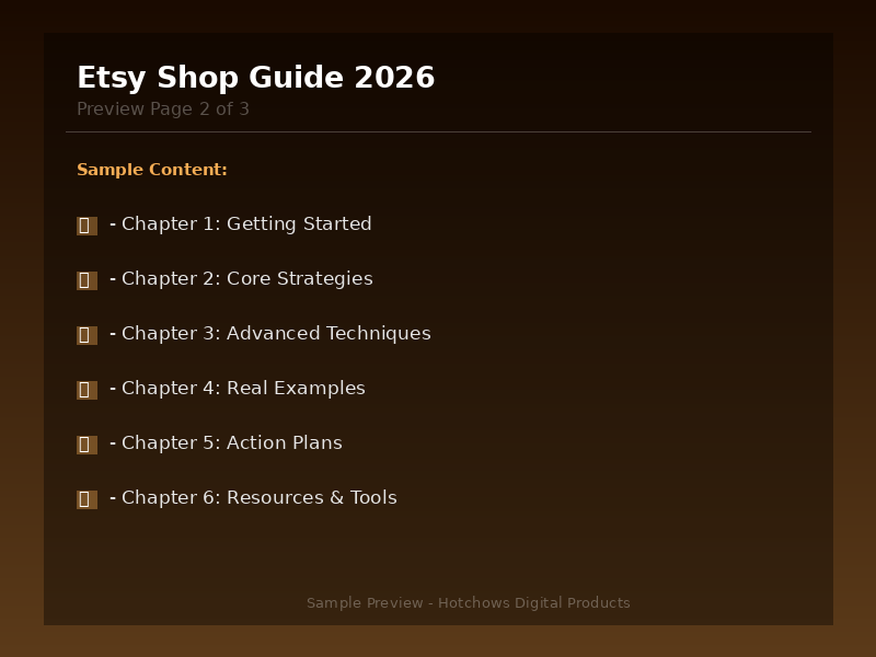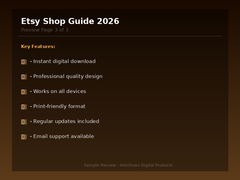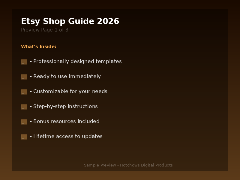 Build a Profitable Etsy Shop From Scratch This 5,000+ word guide covers everything from setup to scaling: • Shop Setup — Account creation, branding, policies • Product Listings — Titles, descriptions, tags that rank • Etsy SEO — How Etsy search works and how to dominate it • Pricing Strategy — Fee calculator + profit margin formulas • Photography — Product photo tips (even with a phone) • Marketing — Social media, Pinterest, and email strategies • Etsy Ads — When to use them and how to optimize • Analytics — Key metrics to track and improve • Customer Service — Templates for common situations • Scaling — From side hustle to full-time income • Common Mistakes — 10 pitfalls to avoid Format: PDF eBook Instant Download