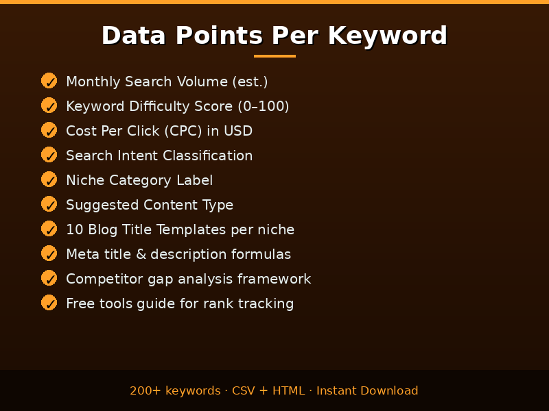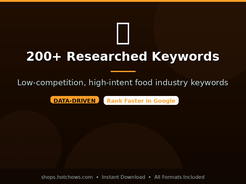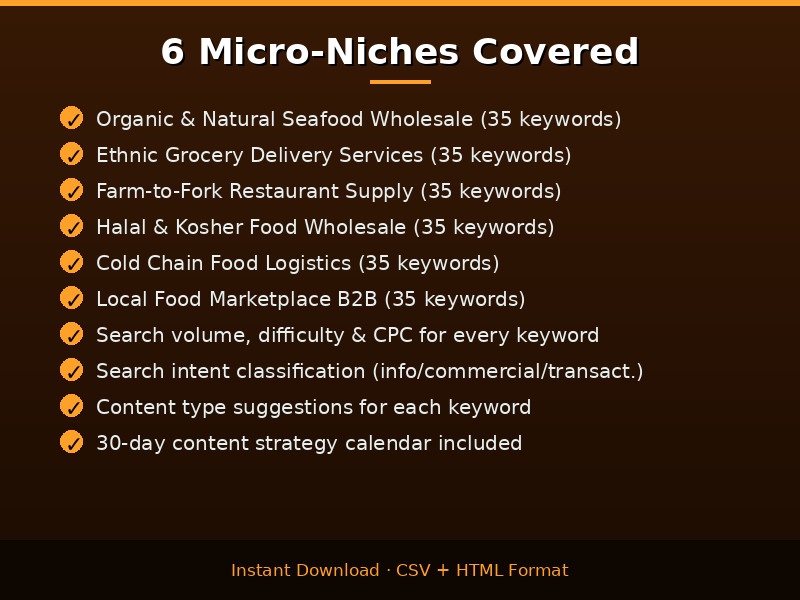 Dominate Google in Your Food Niche Stop guessing which keywords to target. This data-driven toolkit gives you 200+ researched, low-competition keywords specifically for the food and logistics industry, complete with all the data you need to create winning content. 6 Micro-Niches Covered • Organic & Natural Seafood Wholesale — 35 keywords targeting B2B wholesale buyers • Ethnic Grocery Delivery Services — 35 keywords for specialty grocery delivery operators • Farm-to-Fork Restaurant Supply — 35 keywords for restaurant procurement professionals • Halal & Kosher Food Wholesale — 35 keywords for specialty food distributors • Cold Chain Food Logistics — 35 keywords for food logistics companies • Local Food Marketplace B2B — 35 keywords for marketplace operators Data Included Per Keyword • Monthly Search Volume (estimated) • Keyword Difficulty Score (0–100) • Cost Per Click in USD • Search Intent (Informational / Commercial / Transactional) • Content Type Suggestion (blog post, product page, landing page, etc.) Bonus Content • 10 Blog Post Title Templates per niche (60 total) • 30-day content strategy calendar • Meta title & description formulas • Free rank tracking tools guide • Competitor keyword gap analysis framework Format: HTML (filterable table) + CSV export Delivery: Instant download after purchase