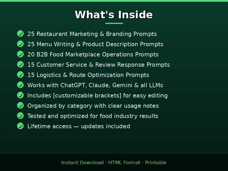 Stop Wasting Time Writing Prompts From Scratch This expertly curated pack contains 100+ ready-to-use AI prompts specifically designed for the food and restaurant industry. Whether you run a restaurant, manage a food wholesale business, or operate a B2B food marketplace, these prompts will help you create professional content in minutes — not hours. What's Included • 25 Restaurant Marketing & Branding Prompts — Social media captions, email campaigns, brand storytelling, Google My Business optimization • 25 Menu Writing & Product Description Prompts — Dish descriptions that sell, seasonal menus, allergen-friendly messaging, upsell copy • 20 B2B Food Marketplace Operations Prompts — Vendor onboarding emails, wholesale catalog copy, RFQ templates, partnership pitches • 15 Customer Service & Review Response Prompts — Negative review handling, loyalty program announcements, complaint resolution • 15 Logistics & Route Optimization Prompts — Delivery delay notifications, cold-chain alerts, customs documentation How It Works • Download the HTML file • Open in any browser • Find your prompt category • Copy the prompt, fill in the [BRACKETS] with your details • Paste into ChatGPT, Claude, Gemini, or any AI assistant • Get professional results instantly Compatible With All Major AI Tools Works with ChatGPT, Claude, Gemini, Copilot, Llama, and any other LLM-based assistant. Format: HTML (works in any browser, printable) Delivery: Instant download after purchase Updates: Free lifetime updates included