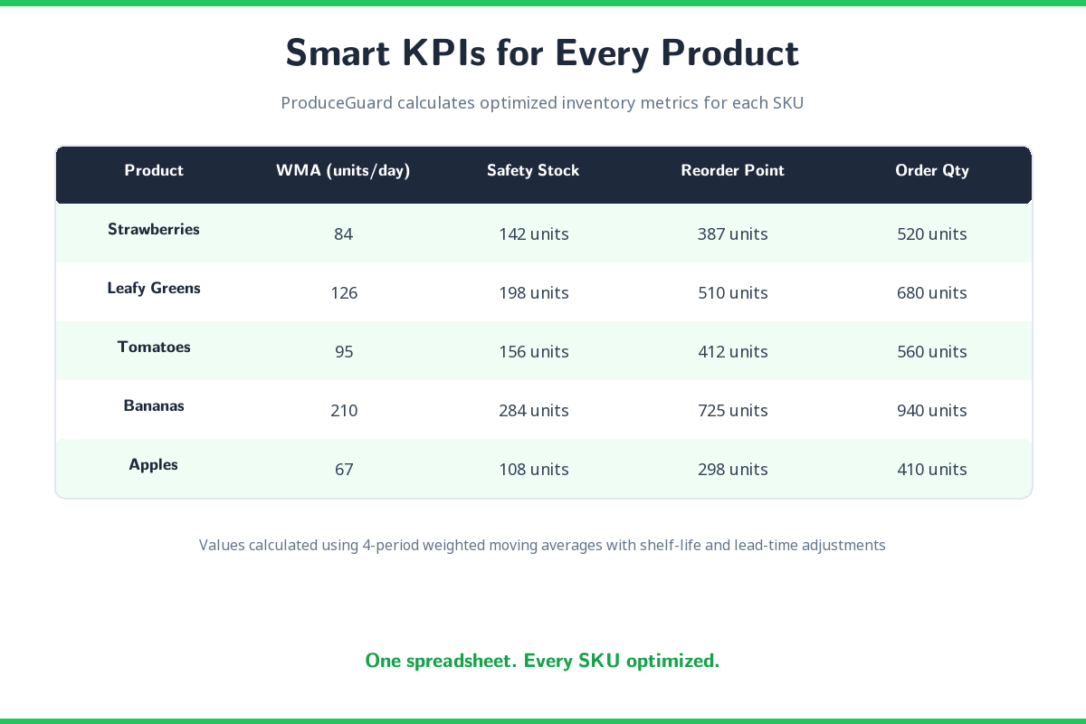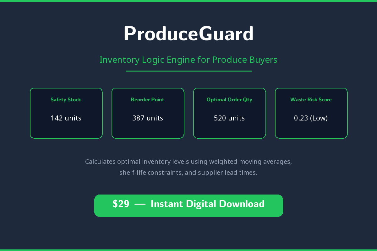 Stop Guessing. Start Calculating. ProduceGuard is a standalone inventory logic engine built specifically for produce buyers. It uses weighted moving averages and perishability-adjusted formulas to tell you exactly how much to order and when to reorder β reducing spoilage and preventing stockouts. What You Get β’ Interactive Dashboard β powered by Streamlit with real-time calculations β’ Safety Stock Calculator β buffer quantities tuned to each item's perishability β’ Reorder Point Alerts β know exactly when to place your next order β’ Optimal Order Quantities β right-sized orders that minimize waste β’ Waste Risk Scoring β see how much you would waste with naive ordering vs. ProduceGuard β’ Multi-Product Support β analyze your entire produce lineup at once β’ CSV Export β download reports for your records or your team β’ Demo Mode β try it instantly with 5 sample produce items How It Works β’ Enter your data β product name, daily usage history, lead time, and perishability factor β’ ProduceGuard calculates β weighted moving average, safety stock, reorder point, and optimal order quantity β’ Review interactive charts β usage trends, order comparisons, and waste reduction projections β’ Export everything β download CSV reports Built for Produce Unlike generic inventory tools, ProduceGuard accounts for perishability. A crate of strawberries is not the same as a pallet of canned goods β ProduceGuard adjusts its calculations based on how quickly your items spoil. Run Anywhere β’ Local: Just pip install and streamlit run on your computer β’ Cloud: Deploy free to Streamlit Community Cloud for team access β’ No subscriptions: One-time purchase, yours forever What is Inside the Download β’ app.py β Streamlit dashboard (main entry point) β’ engine.py β Core inventory calculation logic β’ sample_data.py β Demo data for 5 produce items β’ requirements.txt β Python dependencies β’ BUYER-GUIDE.md β Step-by-step setup instructions β’ README.md β Quick start guide Requirements Python 3.9+ β works on Windows, Mac, and Linux. Perfect For β’ Produce buyers at grocery chains β’ Restaurant purchasing managers β’ Farm-to-table supply coordinators β’ Warehouse managers handling perishables β’ Anyone ordering fresh produce regularly Zero Monthly Fees One-time purchase. Run it on your own computer, or deploy free to Streamlit Community Cloud. No subscriptions, no per-calculation fees. Easy Setup Three commands: pip install, streamlit run, done. The included Buyer Guide walks you through every step β no programming experience needed to use ProduceGuard. FAQ Do I need to know Python? No. You just run two commands. The Buyer Guide explains everything. Are there monthly fees? No. One-time purchase, free to run forever. How many products can I track? Unlimited. Add as many produce items as you need. Can my whole team use it? Yes. Deploy to Streamlit Cloud for free and share the URL with your team.