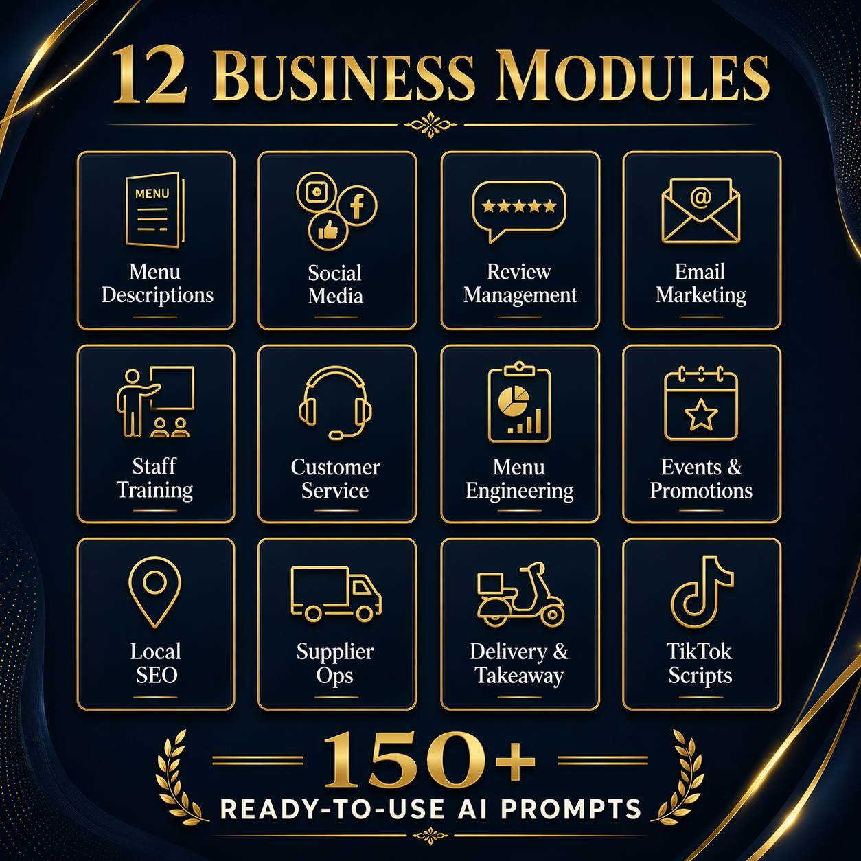 Went through all 12 modules over a weekend. The coverage is remarkable: menu copy, social, reviews, email, HR, events, SEO, suppliers, delivery, video scripts. Every part of my restaurant marketing and operations is covered. The TikTok scripts module alone generated our first viral video at 84k views.