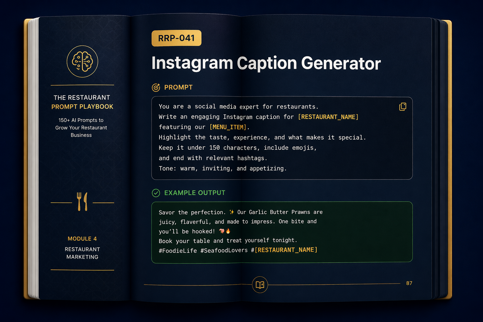I own a small Italian trattoria in Chicago and this pack saved me hours every week. The menu description prompts alone are worth 10x the price β my Osso Buco description got customers asking for it before they even sat down. Highly recommend to any restaurant owner who wants to look professional online without hiring a copywriter.
