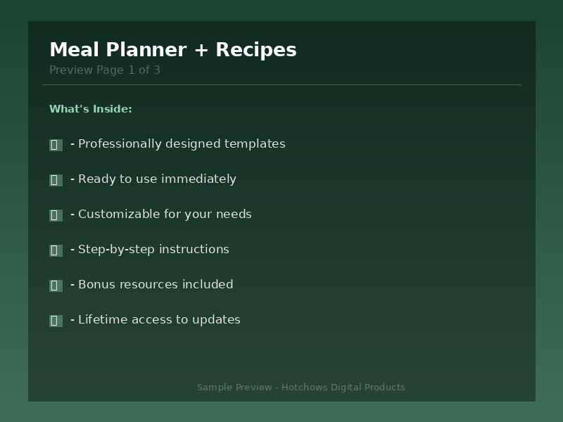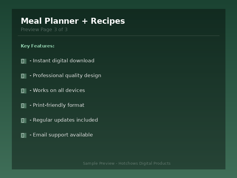 Eat Better, Save Time, Waste Less Food This complete meal planning system includes: • 7-Day Meal Plan Grid — Breakfast, lunch, dinner, and snacks • Organized Grocery List — By department (produce, dairy, meat, pantry, frozen, beverages) • Meal Prep Schedule — Sunday prep guide to save hours during the week • Nutritional Tracking — Calories, protein, carbs, fat tracking • 20 Quick Recipe Cards — Healthy meals ready in 30 minutes or less Format: PDF (printable, reusable) Instant Download
