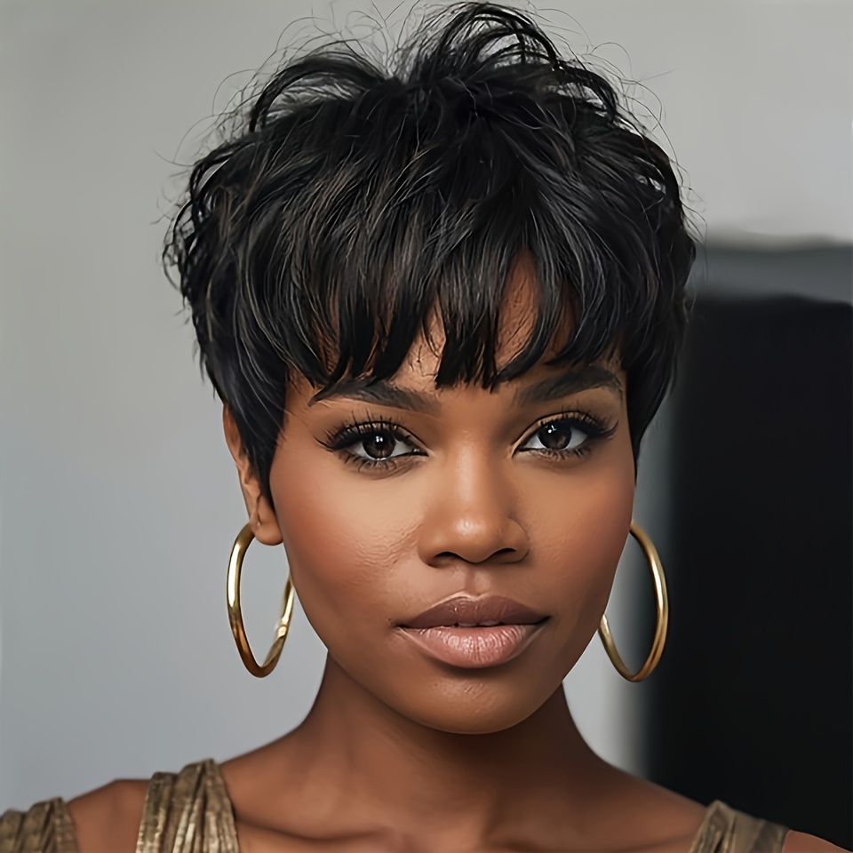 Wig Featuring A 150% Density Human Hair Cut, Designed With Short Layers And Bangs, With A In Shade, Use Without A Lace Front This product is available on TEMU. Click the button above to view full details, photos, and reviews on the TEMU website. Prices may vary.