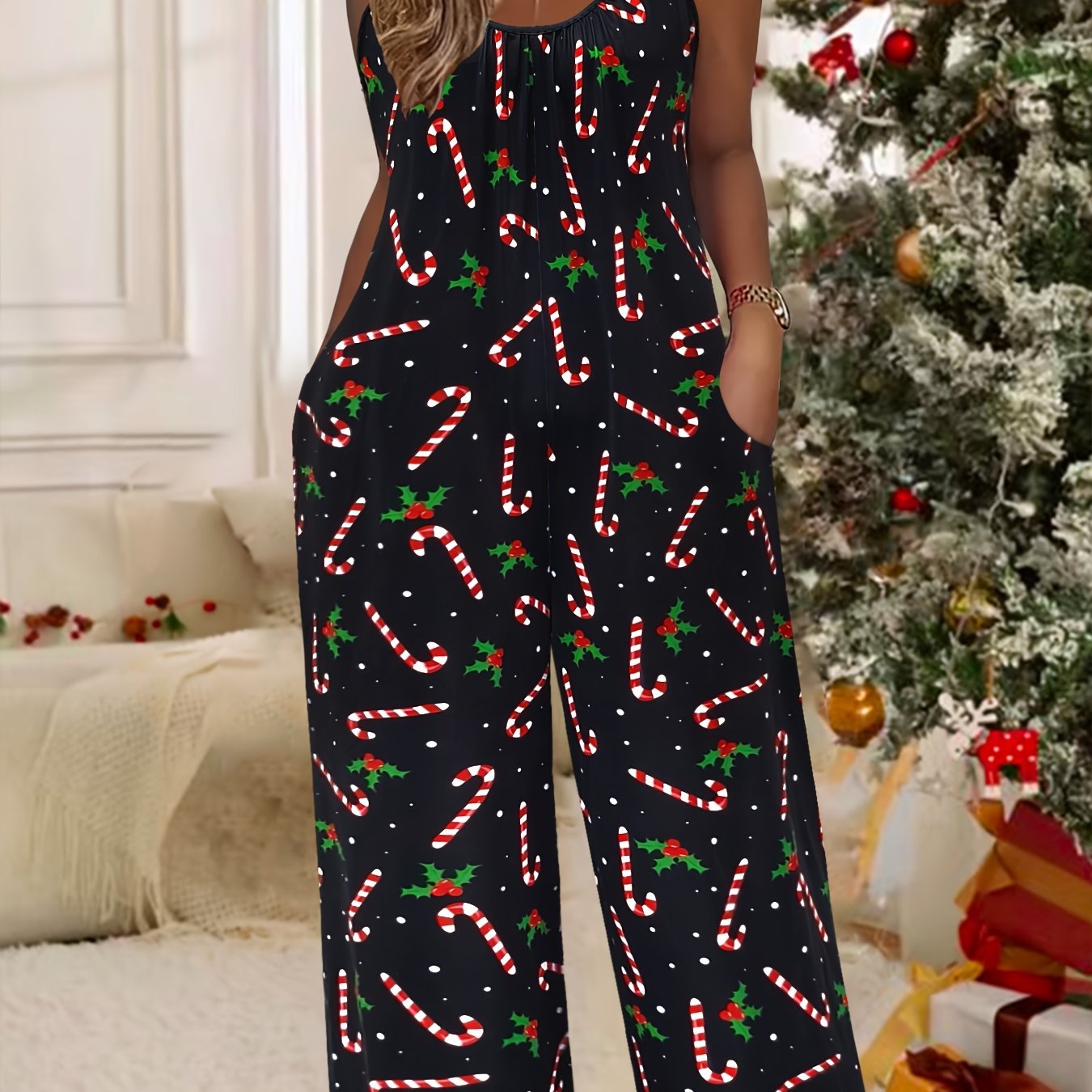 Women's Fashion Christmas Print Jumpsuit With Round Neck, Pleated Pockets, Casual Wide-leg Pants, And Suspender Straps